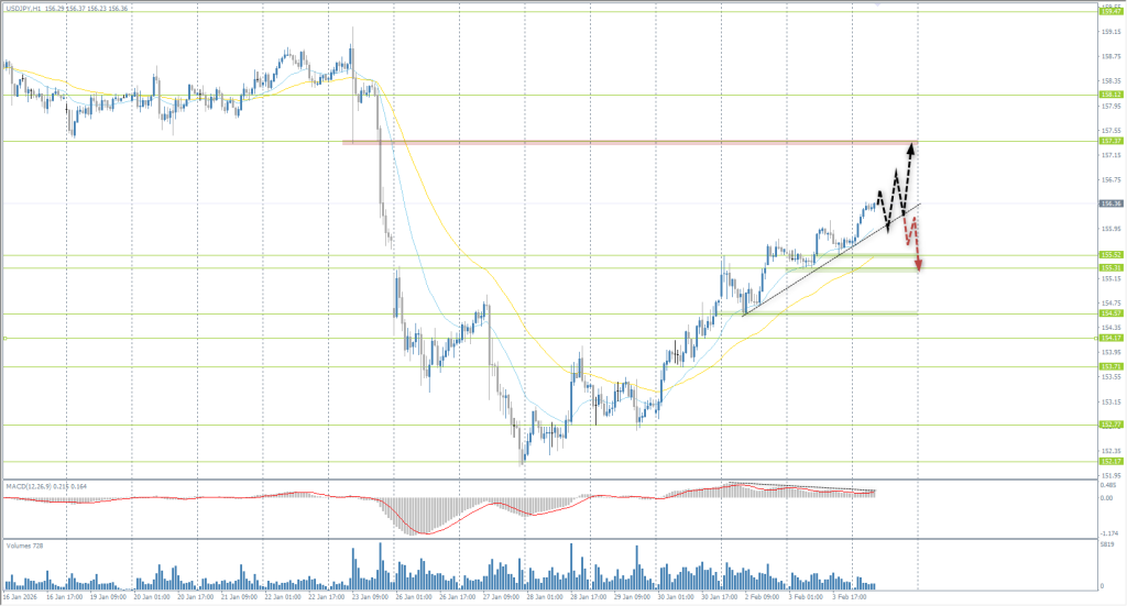 The technical outlook for the yen indicates a lack of significant resistance levels until 157.37. The price is moving steadily upward, with EMA lines acting as effective dynamic support. While a divergence is forming on the MACD, signaling some weakening of the upward momentum, it is premature to discuss a reversal without clear counter-initiative from sellers. In the current environment, it is logical to look for intraday buys from the EMA lines or the 155.31-155.52 support zone.