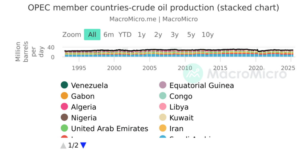 منذ أبريل 2025، بدأت أوبك+ في تخفيف بعض بنود تخفيضاتها الطوعية السابقة. أعلن التحالف عن زيادات جماعية بلغت بضعة ملايين برميل يوميًا، لكن مكاسب الإنتاج الفعلية كانت أقل من المخطط لها، مما جعل المجموعة في بعض الأحيان أقل من أهدافها المعلنة بما يتراوح بين 400 ألف و500 ألف برميل يوميًا. يعكس هذا الفارق الحدود الفنية في دول مثل كازاخستان والعراق والجزائر، وتقييدًا متعمدًا من جانب بعض الأعضاء. لذلك، يتتبع التجار والوكالات كلًا من تغييرات الحصص المعلنة وبيانات التسليم الفعلية لتقييم مدى ضيق السوق.