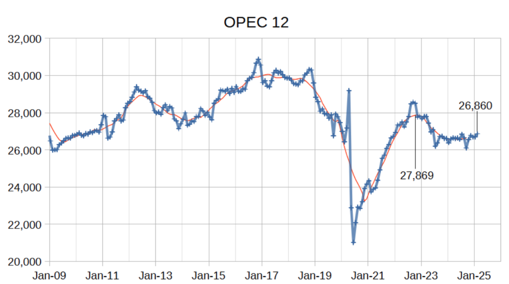 من بين المنتجين المهمين الآخرين العراق والإمارات العربية المتحدة والكويت وكازاخستان وفنزويلا. منذ أبريل 2025، أعلنت أوبك+ عن زياداتٍ بلغ مجموعها عدة ملايين برميل يوميًا في تغييرات الحصص المخطط لها، لكن عمليات التسليم الفعلية تفاوتت، مما جعل المجموعة تنتج بضع مئات الآلاف من البراميل يوميًا دون الأهداف المعلنة في بعض الأحيان. تؤثر فجوات التسليم هذه، بالإضافة إلى خطط التعويض المُحدّثة التي قدمتها روسيا والعراق والإمارات العربية المتحدة والكويت وكازاخستان وسلطنة عمان، على مدى شحّ الأسواق فعليًا.