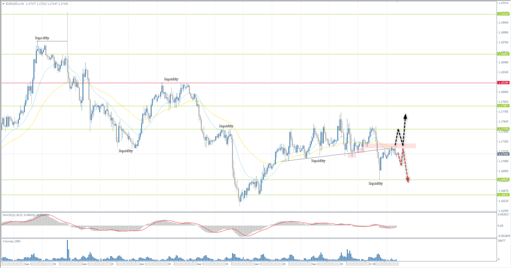 The EUR/USD currency pair’s hourly trend is downward. After three days of consolidation, the price impulsively settled lower. This opens up opportunities for selling from the resistance level of 1.1717 or from the EMA lines. The profit target is to break the weekly low of 1.1683. If the price sharply and impulsively returns above 1.1717, this scenario would form a locked balance, and the intraday bias should shift to buying with a target of 1.1754 and higher.
