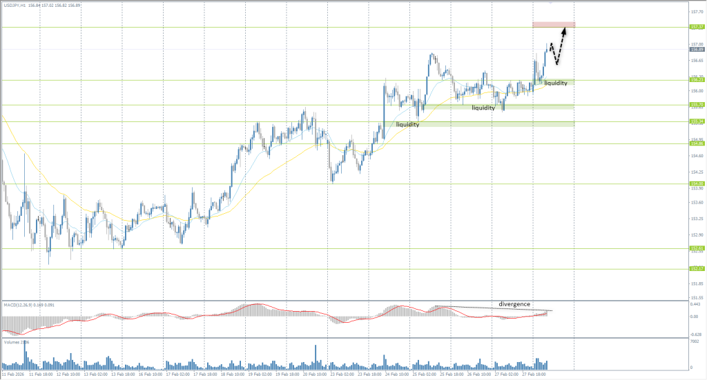 USD/JPY quotes demonstrated strong bullish momentum, breaking out of a two-day range. The Japanese currency is weakening under the pressure of three factors simultaneously: the sharp strengthening of the dollar as a haven due to the Persian Gulf war, the de facto blockade of the Strait of Hormuz threatening Japan’s energy security, and the internal political conflict. From a technical standpoint, the pair is aimed at testing the liquidity zone above 157.37. To enter the market within this strong upward trend, it is most justified to look for joining points on local pullbacks to intraday support levels or Moving Averages (EMA). There are currently no optimal entry points for sales.