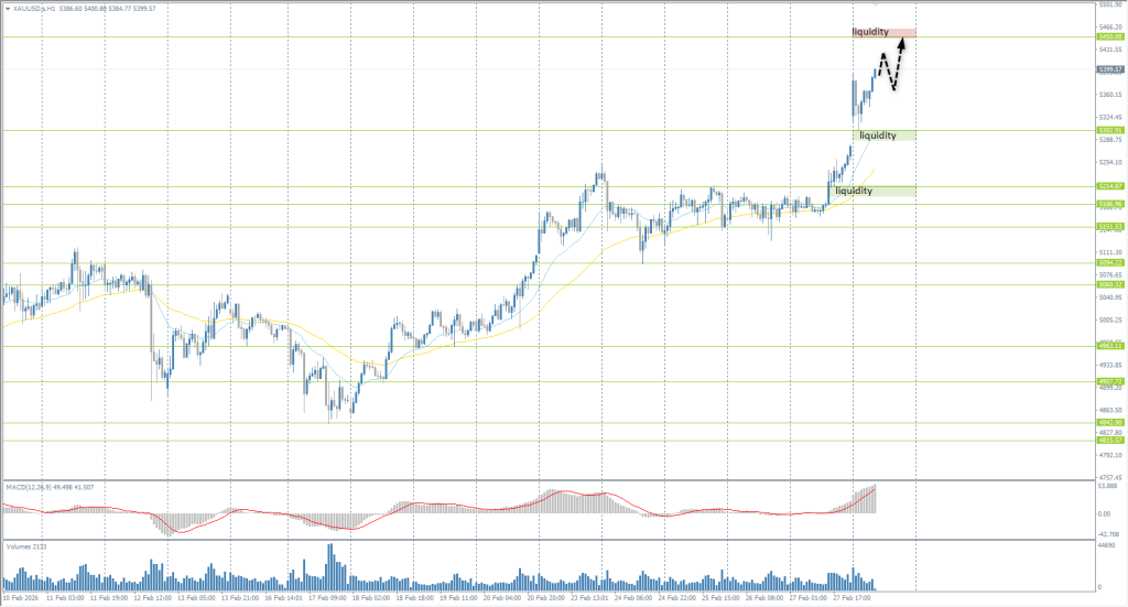 Gold quotes on Monday, March 2, demonstrated a powerful vertical takeoff, opening with a substantial bullish gap amid the escalation in the Persian Gulf and the death of Ayatollah Khamenei. Intraday priority remains strictly upward, as the precious metal currently serves as the world’s primary haven from geopolitical chaos and the energy crisis. Although the price has significantly deviated from its average values and appears overbought, attempting to find sell points under such momentum is highly unwise. Technically, the main target for the continued rally is the liquidity zone above the psychological level of 5450 per ounce. For a safe entry into long positions, it is most advisable to wait for local corrections to intraday support levels or Moving Averages (EMA), which can act as dynamic support for the price. At this moment, any sells lack fundamental justification and optimal entry points.