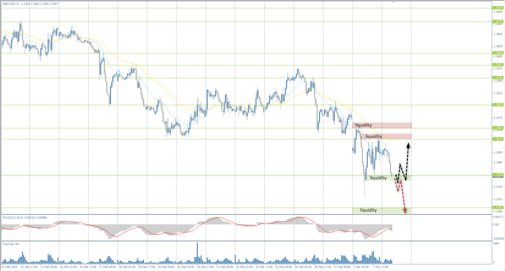 Amid the global flight of investors to safe-haven assets and the rapid strengthening of the dollar, the euro continues to lose ground. At this stage, how the market reacts to the liquidity zone below 1.1673 is of key importance. In the absence of buyer support and if the downward momentum persists, the next target for the decline will be 1.1634. However, if buyers seize the initiative in the liquidity zone below 1.1673 and form a base for a reversal, a corrective rise to 1.1707 becomes possible. MACD divergence also increases the probability of a correction.
