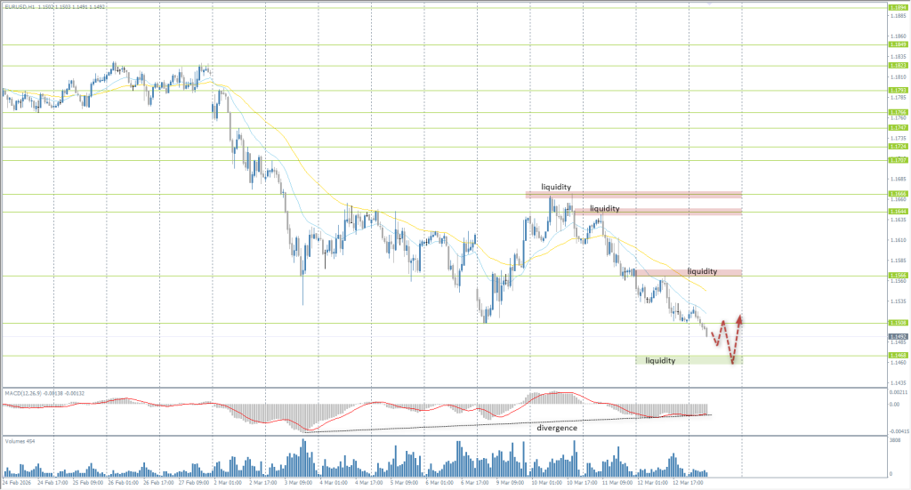 Quotes are trending toward a test of the liquidity pool below 1.1468. It is important to evaluate price action here: given the MACD divergence, a reaction from buyers could trigger a corrective wave. In such a scenario, intraday buy trades can be considered within a correction with a minimum target of 1.1508 and potential movement up to 1.1566. If sellers push through the 1.1468 support level with momentum, the decline may accelerate to 1.1375, though this scenario is less likely.