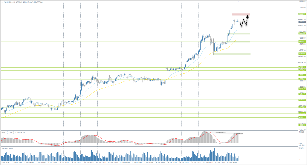 Gold continues to hit all-time highs and is moving steadily toward the $5,000 per ounce mark (a strong psychological and options level). Selling at current levels appears premature until a large seller emerges. Currently, there are no signs of such presence or active profit-taking by buyers. The market structure remains bullish. Therefore, intraday priority should still be given to long positions, targeting the nearest support levels and dynamic EMA lines.