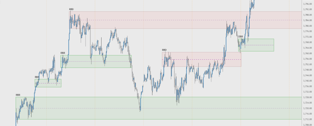 5. Los objetivos de beneficio suelen ser las zonas opuestas. Por ejemplo, si abriste una posición de compra desde una DBR, tu primer objetivo sería una zona DBD y tu objetivo principal sería una RBD.