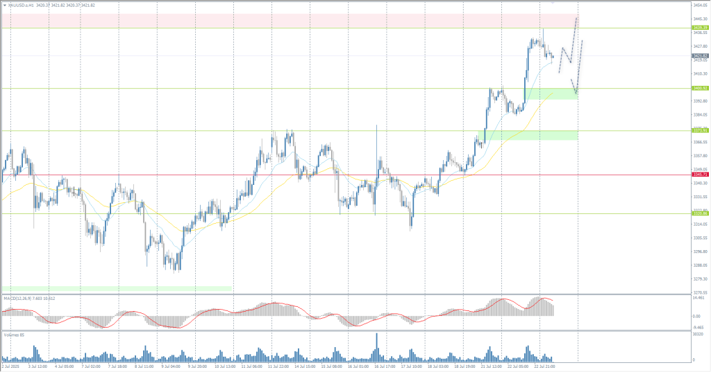 From the point of view of technical analysis, the trend on the XAU/USD is bullish. Gold continues its rally. The price has now reached the resistance level of 3439, where there are initial signs of fixing, but this is not enough for a full reversal. For buy deals, it is worth considering the EMA levels or the support level of 3400. There are currently no optimal entry points for sales.