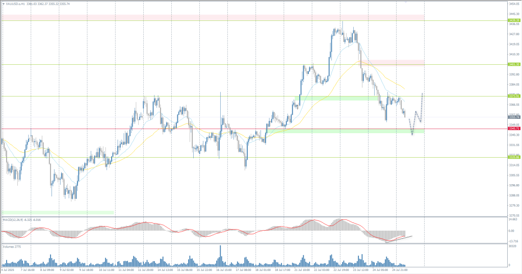 On Friday, gold prices fell to around $3,360 per ounce, marking the third consecutive day of decline, as concerns about tariffs continued to ease, reducing the appeal of the precious metal. Investors continue to monitor the progress of trade negotiations. According to reports, the US and the EU are close to reaching an agreement, shortly after Washington announced the conclusion of a separate agreement with Japan. On the economic front, US jobless claims fell for the sixth consecutive week, marking the longest decline since 2022, which underscores the strength of the labor market. This has reinforced the view that the Federal Reserve will keep rates unchanged at its meeting next week, but markets are still pricing in a possible rate cut in September.