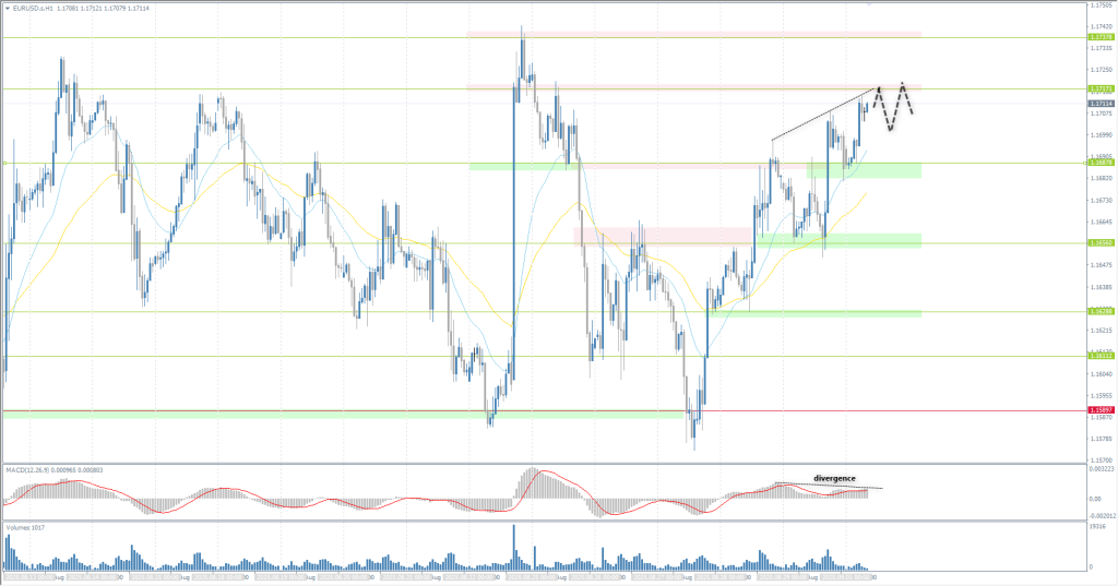 The EUR/USD currency pair’s hourly trend is bullish. The euro has consolidated above 1.1687 and is now aiming to test 1.1717. Given the MACD divergence, previously opened buy positions may be closed here, which could lead to the formation of a flat. A breakout and consolidation above 1.1717 will open the way to liquidity above 1.1737. There are currently no optimal entry points for selling.