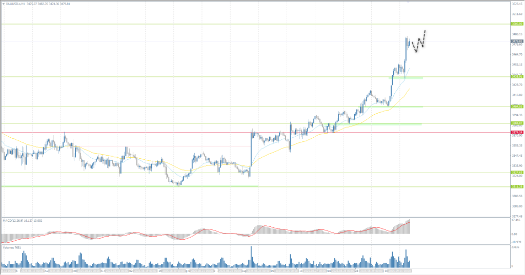 From the point of view of technical analysis, the trend on the XAU/USD is bullish. Gold continues to rally and is aiming to renew its historic high of 3500. There are no signs of a reversal: the MACD indicator is rising without divergence, and volumes also point to buyer interest. There are currently no optimal entry points for selling. Buy deals should be considered on intraday time frames, but it should be noted that on the hourly time frame, the price has deviated significantly from the average lines.