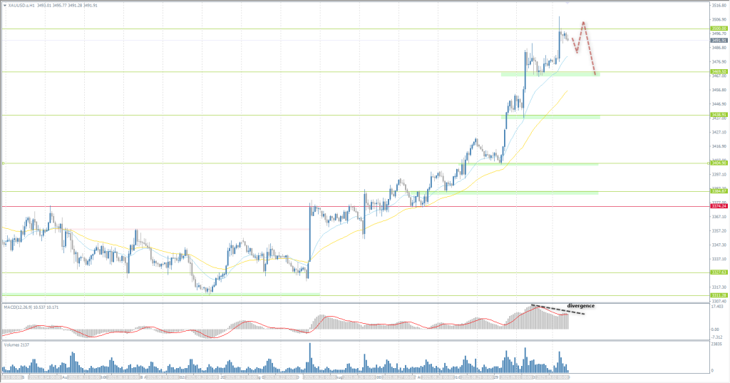 From the point of view of technical analysis, the trend on the XAU/USD is bullish. Gold has reached its previous historical high of 3500. The MACD indicator points to divergence, but the price may make another update to the high for greater liquidity capture. Buying here is not recommended. For sales, it is necessary to wait for initiative from sellers, which is also absent at the moment.