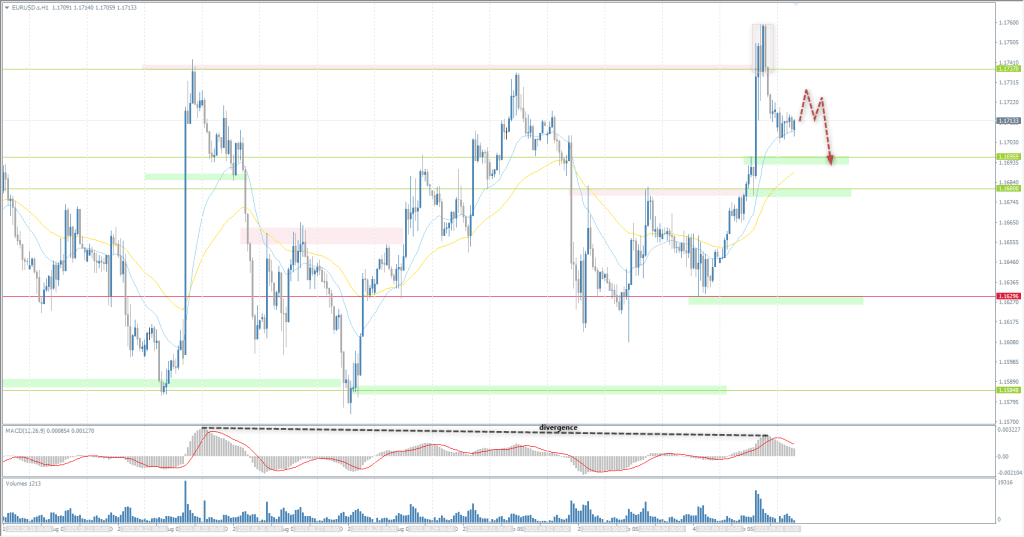 The EUR/USD currency pair’s hourly trend is bullish. On Friday, the euro reached the resistance level of 1.1737, where, after accumulating liquidity, the price sharply consolidated below, forming a “locked” balance above. Currently, this liquidity is distributed lower, which is also confirmed by the MACD divergence. Today, it is worth considering selling to 1.1696 or 1.1680 intraday. It is important for sellers not to let the price re-consolidate above 1.1737.