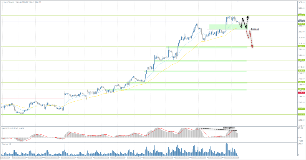 From the point of view of technical analysis, the trend on the XAU/USD is bullish. Gold has found a ceiling around 3600, where a flat accumulation is beginning to form. Given the MACD divergence, buyers should be extremely cautious here, as conditions for a correction are forming. It is important for buyers to keep the price above 3560 to maintain the bullish rally. A sharp drop below this level could trigger a correction.