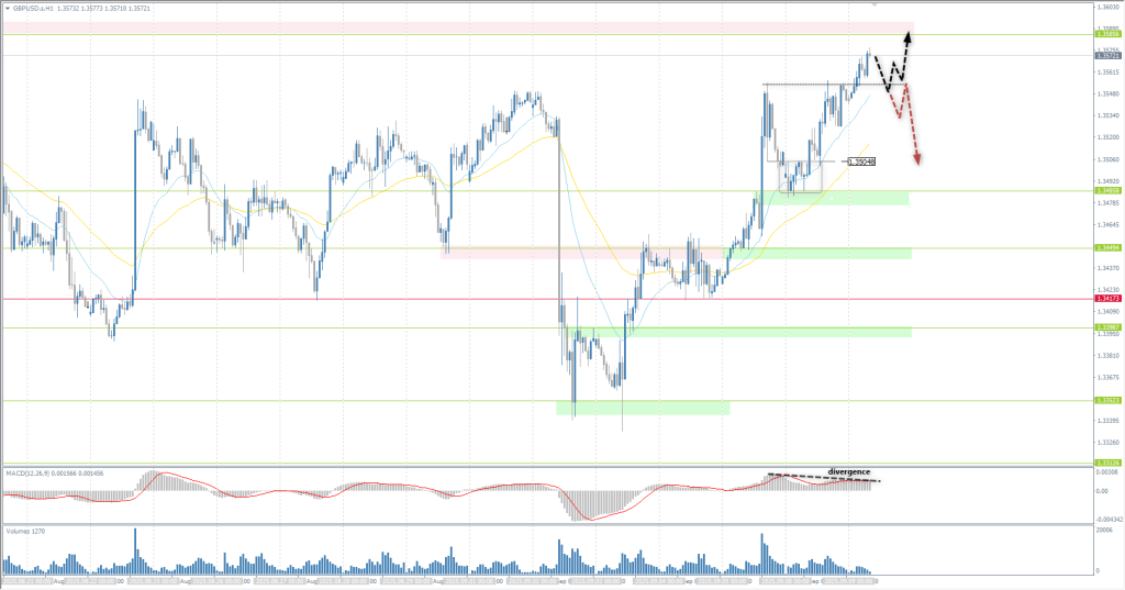 In terms of technical analysis, the trend on the currency pair GBP/USD has changed to upward. The British currency is heading towards the resistance level of 1.3585, above which there is a large accumulation of liquidity. The MACD indicator signals a divergence, which increases the likelihood of a correction from 1.3585. A sharp drop in price below 1.3549 could trigger a sell-off.