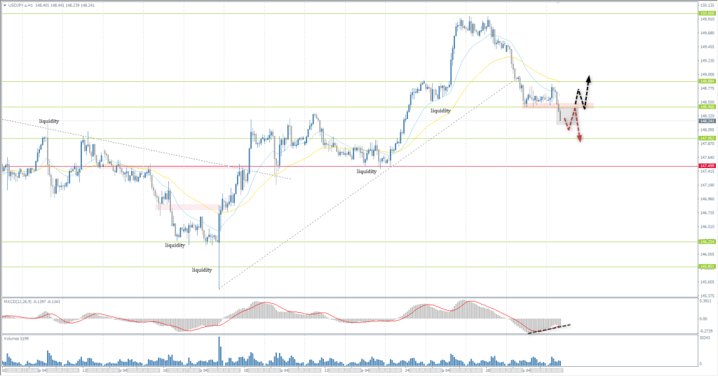 From a technical point of view, the medium-term trend of the USD/JPY is upward. The price fell slightly short of the psychological 150 mark. The corrective decline began earlier, and the price has now broken the 148.47 support level. It is important to evaluate the price action here. At the moment, there is a high probability that the price will continue to decline toward 147.95. However, there is also a small chance of price accumulation below 148.47 followed by an impulsive close above the level. In this scenario, buy trades could be considered.