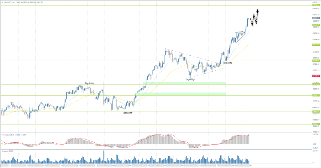 From the point of view of technical analysis, the trend on the XAU/USD is bullish. Gold continued its rally. The price closed impulsively above 3850, which increases the likelihood of further gains. For a reversal or correction to occur, we would need to see a locked balance above the resistance level or, at a minimum, a bearish impulse. As neither of these is present yet, looking for selling opportunities is premature, despite the MACD divergence. For buys to continue the trend, the best entry points are the EMA lines or the 3850 level, but with confirmation in the form of a bullish reaction.