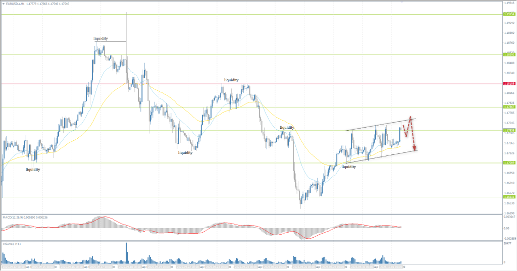 The EUR/USD currency pair’s hourly trend is downward. The euro reached the 1.1754 resistance level, after which the price entered a sideways consolidation (flat). A breakout of this level will open the path for the price to 1.1786 and higher. However, given the MACD divergence and the bearish reaction to the level, intraday sales can be considered down to the lower boundary of the flat or to the 1.1709 support level.