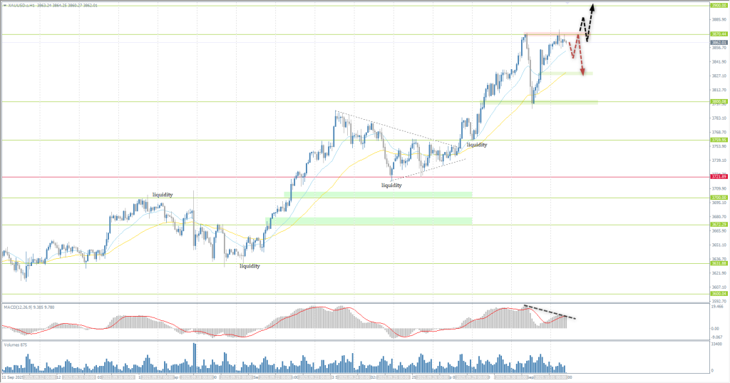 From the point of view of technical analysis, the trend on the XAU/USD is bullish. Gold sharply corrected to 3800 yesterday amid profit-taking ahead of the holidays in China. However, the price returned to its morning values during the day due to the likely US government shutdown. This resulted in a high-volatility flat consolidation with boundaries of 3800-3870. An impulsive breakout of 3870 will open the way for the price to 3900, so buy deals should only be considered after a breakout of this level. Given the MACD divergence and the sellers’ reaction at 3870, the price may fall today to the 3830-3850 range.