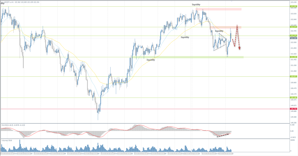 The medium-term trend is bullish. The price impulsively broke through the resistance level of 153.27. Above this level, there is a large accumulation of liquidity. If sellers do not react here, we can expect further price growth to 154.80. A sharp return of the price below 153.27 will form a locked balance above the level, which could lead to a sharp sell-off.