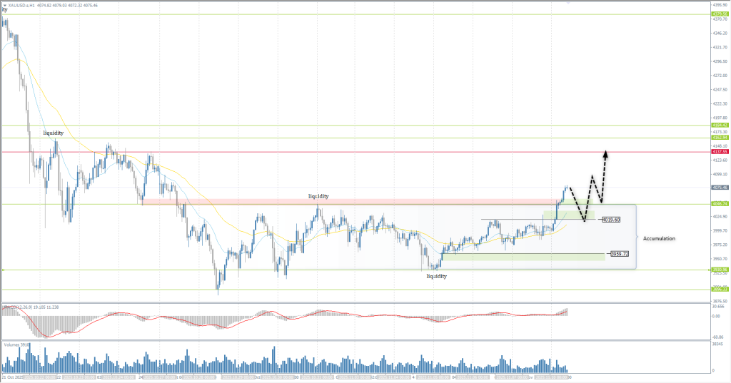 On Monday, gold rose above $4,050 per ounce amid weak US data and expectations of a Fed rate cut in December. The University of Michigan Sentiment Index fell close to a historical low, layoffs reached a 20-year high, and private reports pointed to further job losses. The probability of a 25 bps rate cut is estimated at more than 70%. Dollar weakness and increased demand for safe-haven assets also supported gold prices.