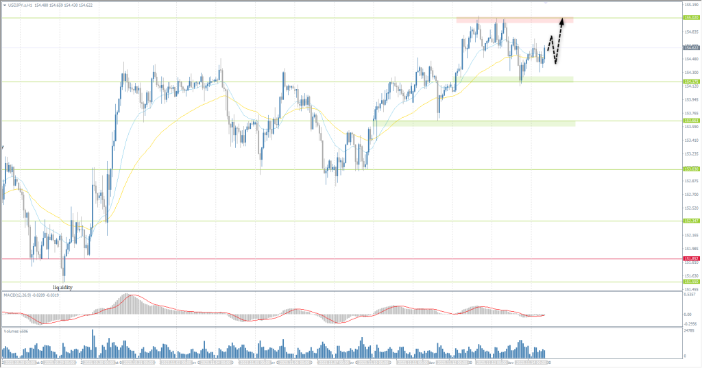 The medium-term trend is bullish. A flat accumulation is forming with boundaries at 154.17-155.02. Intraday bias favors buyers, but the price is in the middle of the balance, complicating entry timing. Buying opportunities are best sought from the lower boundary, and selling from the upper boundary, but confirmation is required in both cases.