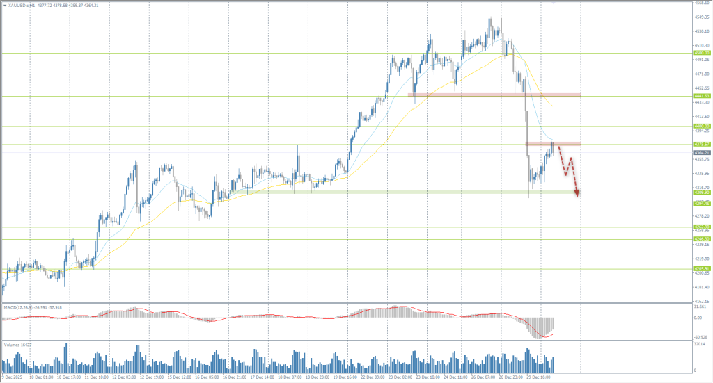 Gold plummeted yesterday due to profit-taking. The price reached the 4309 support level, where buyers began to show activity. Following such a sell-off, there is no need to rush into buys, especially before the holidays. Intraday, sales from the EMA lines or the 4375 resistance level can be considered, but with confirmation. There are currently no optimal entry points for buying.