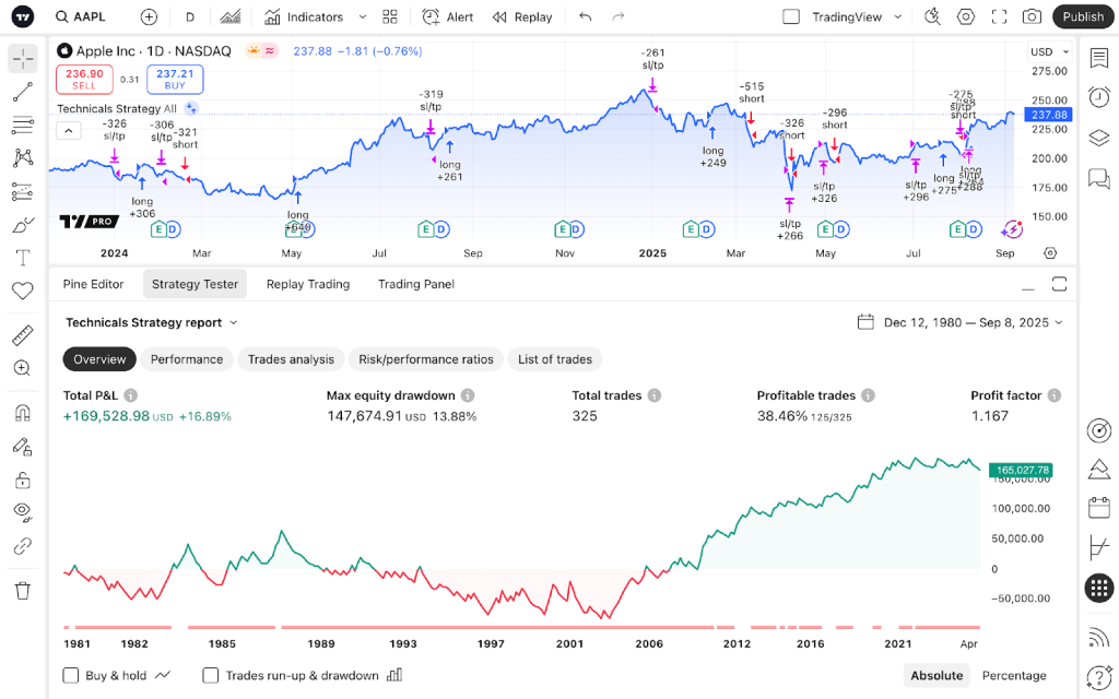 Di TradingView, Anda bisa menguji baik pasangan mata uang maupun CFD menggunakan alat bantu analisis bawaan. Untuk strategi algoritmik, terdapat bahasa Pine Script, yang memungkinkan Anda untuk membuat dan menguji sistem trading yang sederhana. Namun, penting untuk dipahami bahwa statistik yang lengkap, akuntansi yang terperinci, dan model eksekusi order yang realistis umumnya hanya tersedia pada paket berbayar.
