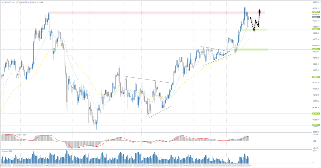 On Monday’s Asian session, price impulsively broke above 4210 and reached resistance at 4246. A breakout above this level would open the path to 4379, so price may consolidate near 4246 to build liquidity. For buys, consider EMA lines or support at 4210 with confirmation. No optimal sell entries at present.
