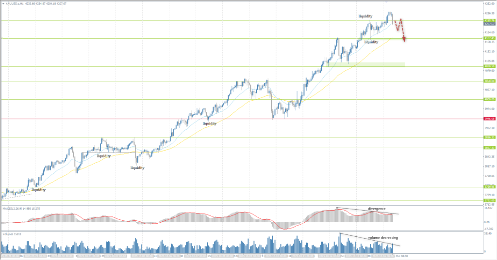 From the point of view of technical analysis, the trend on the XAU/USD is bullish. However, given the prolonged divergence on the MACD indicator and the decline in volume at highs, all of these point to an impending correction. Gold needs liquidity for a further rally. The nearest liquidity pool is below 4167. Intraday, sales to this level can be considered, but only with confirmation and with short stop losses, as these will be countertrend trades. For buy deals, it is better to wait for a correction to 4167 or 4090, as it is too high.