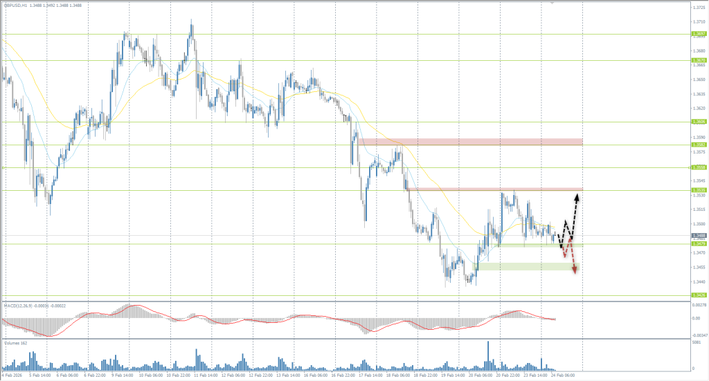 On Tuesday, February 24, the British pound is showing a corrective movement, returning to the origin of yesterday’s bullish impulse. Traders’ primary focus is now on the 1.3479 support level. This zone coincides with session lows and acts as a key indicator of buyer strength: if a confident price reaction and buyer initiative are recorded here, it will create a foundation for a recovery in quotes. If the 1.3479 level is broken by an impulsive downward movement, it will trigger a wave of sell-offs. In this case, the next target for the bears will be the 1.3455 support or lower levels.