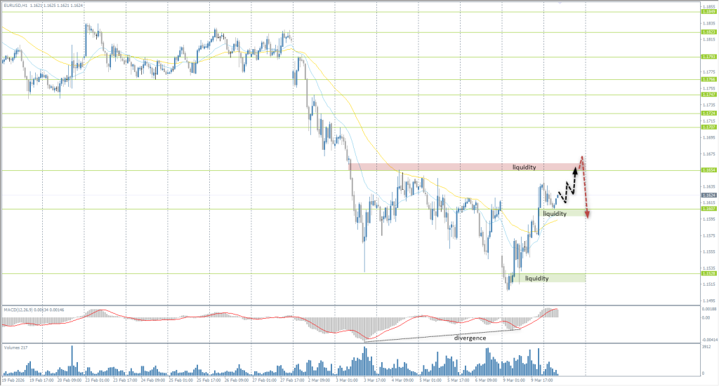 The European currency recovered yesterday, fully closing the opening price gap. Furthermore, the price closed impulsively above the EMA lines, shifting the price structure. Intraday bias has been seized by buyers. Under these conditions, buy trades can be considered intraday from the 1.1607 support level, targeting 1.1654. It is then crucial to evaluate the price reaction at this liquidity point; if sellers show initiative at 1.1654, it may open selling opportunities.