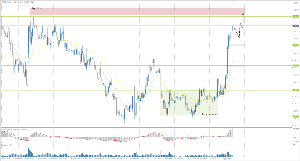 The British pound, following the euro, surged sharply amid de‑escalation in the Middle East. Prices jumped impulsively, forming a new bullish phase. The pair is now moving toward liquidity above 1.3457, where the first profit‑taking may occur. Intraday focus should remain on long positions, though the challenge is that the price has deviated significantly from the EMA lines. The best approach is to wait for a pullback toward support at 1.3378 or toward the EMA lines. There are no optimal short setups at the moment.