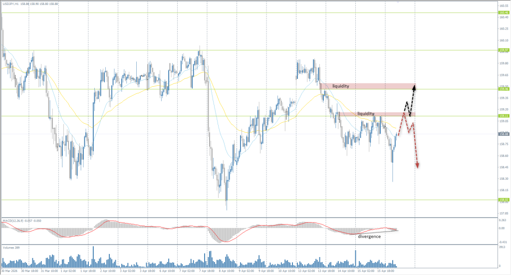 Technically, sellers are beginning to take intraday initiative. Buyers failed to keep the price above 158.65, which potentially opens the way toward 158.02. For selling, it is best to focus on the EMA lines or the resistance level of 159.11, but with confirmation. Long trades are appropriate only after the price consolidates above 159.11.