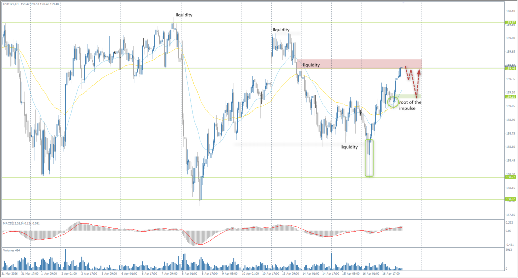 Technically, the price has reached the resistance level of 159.46, above which liquidity is located. If sellers react here, short trades may be considered with a target at the root of the bullish impulse at 159.15. An impulsive consolidation above 159.46 will open the way toward 159.85.