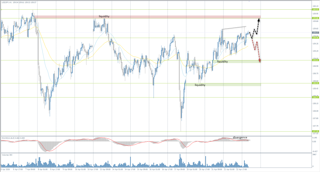 After testing liquidity above 159.46, the price failed to reach the opposing liquidity pool below 159.01. The price consolidated near the EMA lines and is again moving toward the upper liquidity test. This indicates intraday buying pressure. Despite the MACD divergence, the price may continue rising toward 159.86. Therefore, if the price remains above the EMA lines, long trades may be considered toward this level. Consolidation below 159.46 and below the EMAs will likely lead to a correction toward 159.01.