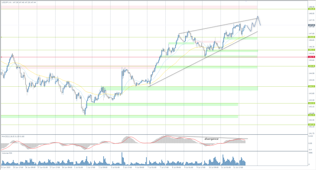 From a technical point of view, the medium-term trend of the USD/JPY is bullish. The Japanese yen continues to lose ground. The price is now heading towards the liquidity zone above 148.28. For buy deals, consider the EMA lines or the support level of 146.80. However, traders need to be cautious, as the divergence on the MACD is a harbinger of a corrective movement.