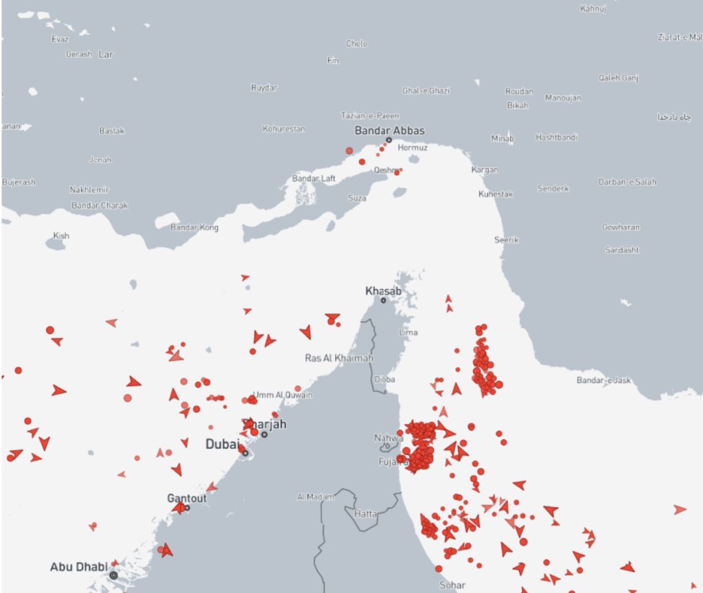 - MarineTraffic: The most popular service. It allows you to see a color-coded map of the world (oil tankers are usually red). Life hack: Use the “Vessels in Area” filter to see the cluster of ships at the entrance to the Strait of Hormuz.