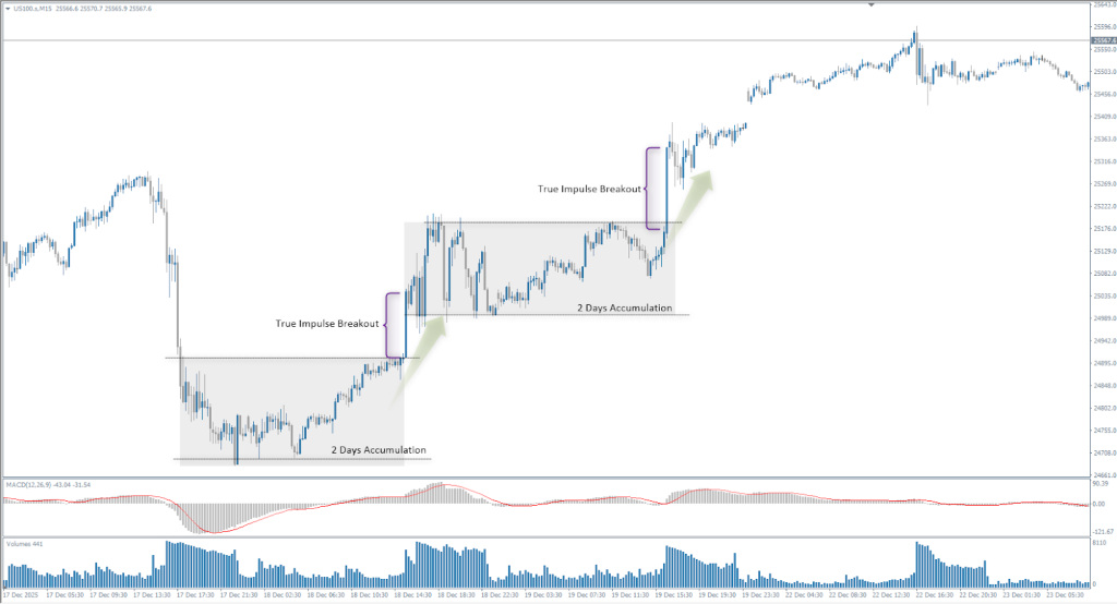 An impulse is almost always preceded by an accumulation phase. The market enters a state of reduced volatility, the range narrows, and movements become erratic and inexpressive. To an untrained observer, it seems that the market is “falling asleep,” but in fact, it is concentrating liquidity. During such periods, large players have the opportunity to gradually build up positions without moving the price too noticeably.