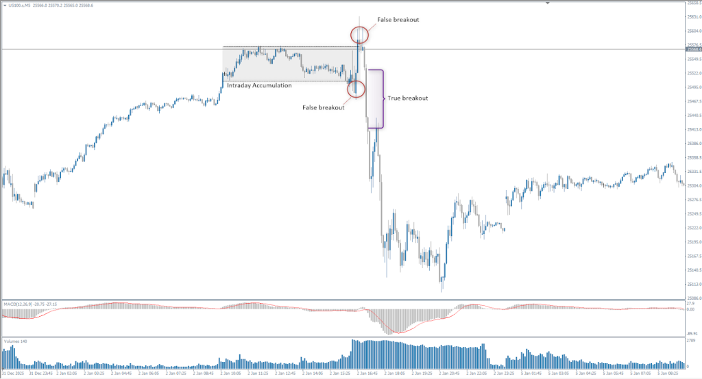 However, not every sharp movement is a real impulse. False impulses are an integral part of the market structure. Their key feature is the lack of continuation. The price may quickly pass a level but almost immediately return, forming long shadows and not holding new values. Such movements are often accompanied by emotional volume and a surge of activity from the crowd. Visually, they look powerful, but structurally, they do not change the market. Very often, if the price makes a false breakout of accumulation on one side, there is a high probability that the price will attempt to break out on the other side of accumulation.