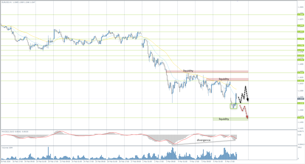 The European currency opened with a downward price gap on Monday and reached the 1.1528 support level. Buyers have shown initiative here, and some short-sellers were trapped below the level. Today, focus on the price reaction at 1.1528. If buyers defend this level, intraday buy trades with short targets can be considered. An additional factor for a correction is the MACD divergence. However, it is vital to understand that the primary trend remains with the sellers, and there is a high probability of a decline to 1.1468 this week.